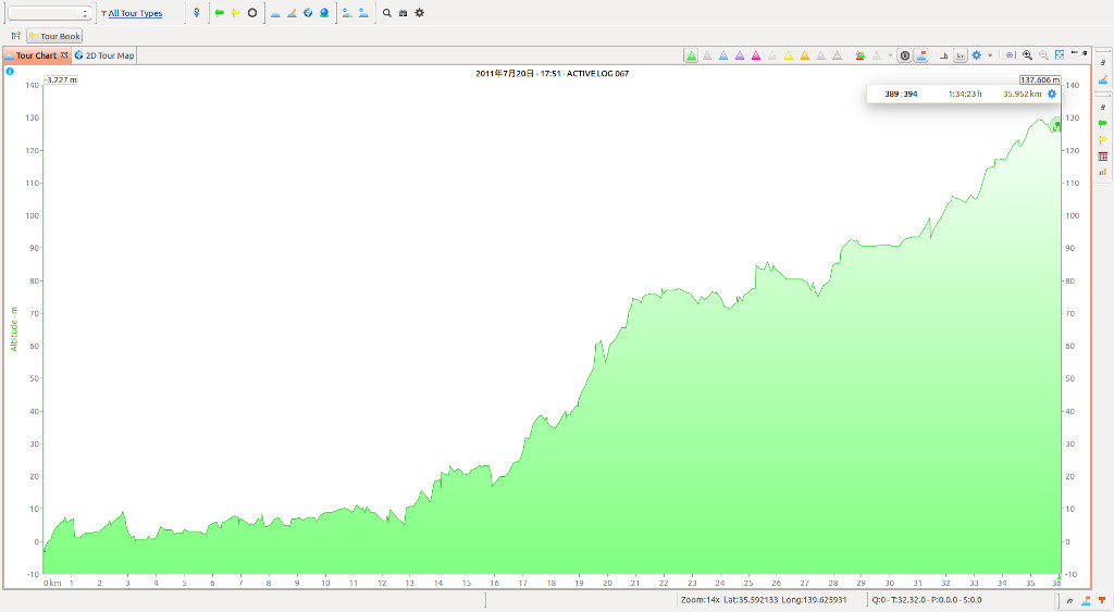 5年前までの更に5年間は相模原から川崎まで片道36kmの自転車通勤をしていた。マップは2011年7月20日水曜日の帰りの記録だ。17:51に会社を出て、1時間36分で自宅に着いている。上りは合計174mだ。相模原は台地の上にあるので、川崎から帰る時はずっと上りだった。