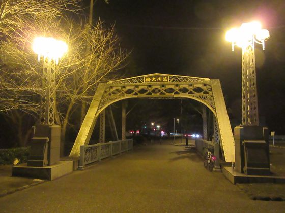 右岸のたもとの旧荒川大橋の前で一休み。ここだけが明るく照らされている。